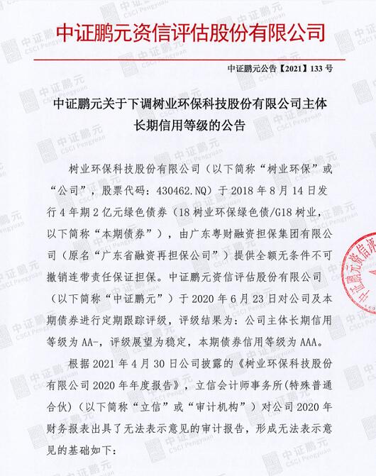 “樹業(yè)環(huán)保資金拆借及股權(quán)轉(zhuǎn)讓交易占用資金規(guī)模較大,相關(guān)款項收回存在一定不確定性,面臨較大的流動性風(fēng)險和債務(wù)壓力!薄獜V東的環(huán)保包裝巨頭面臨著巨大的危機(jī)! 5月14日,中證鵬元公告稱,將樹業(yè)環(huán)保科技股份有限公司(以下簡稱“樹業(yè)環(huán)!保┲黧w長期信用等級由AA-下調(diào)為A,評級展望由穩(wěn)定調(diào)整為負(fù)面。