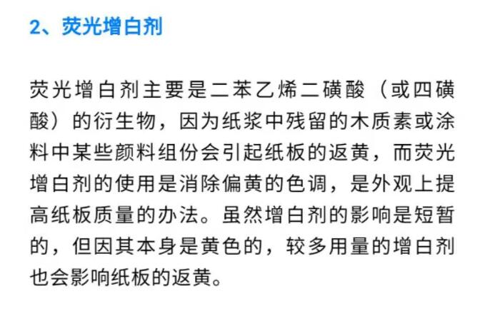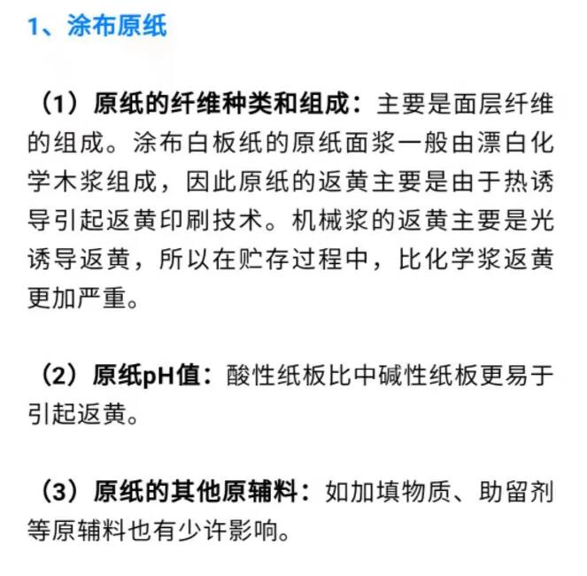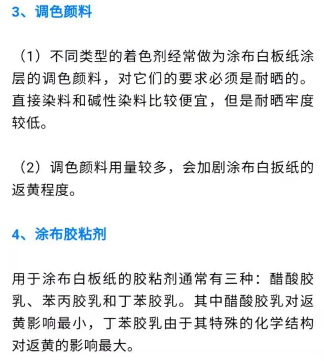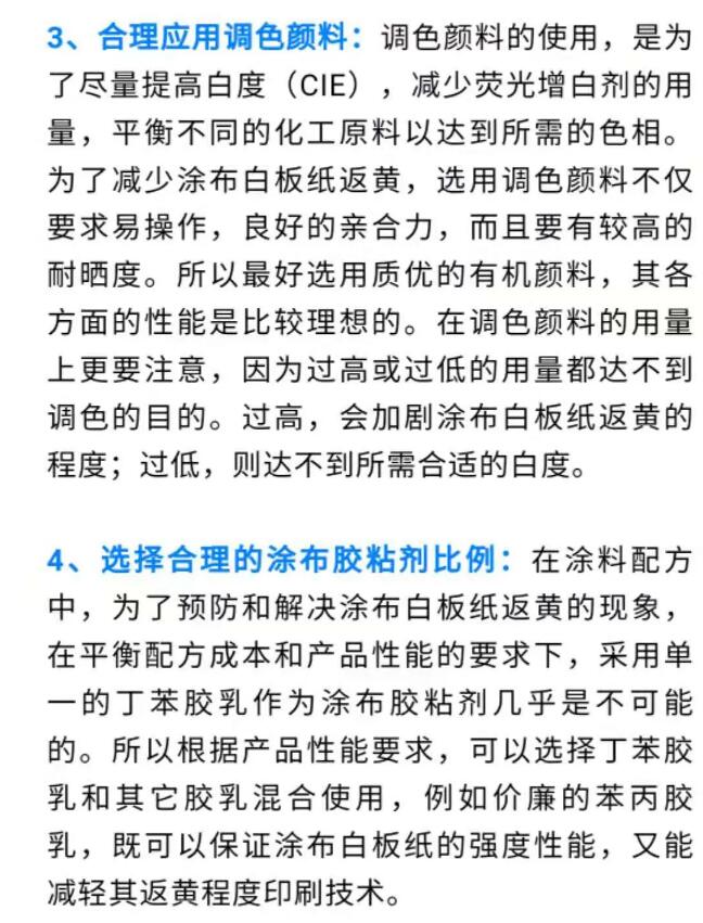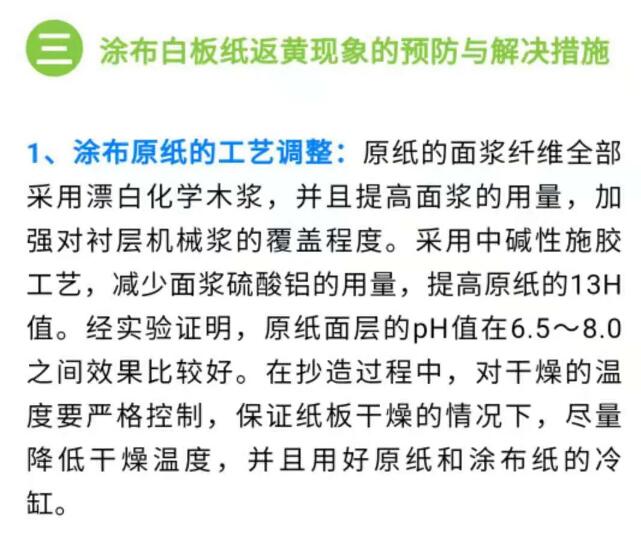 結論 1、在解決涂布白板紙返黃問題的生產實踐過程中,涂布原紙、熒光增白劑、調色顏料和膠粘劑方面是影響返黃的主要因素。改善原紙生產的工藝條件,選用質優的熒光增白劑、調色顏料,調整好最佳用量;科學確定膠粘劑的最佳搭配,可以有效地減輕涂布白板紙的返黃現象。 2、選用新型的化學助劑,例如納米硅基氧化物、紫外線吸收劑和抗氧化劑等化工產品也會減輕涂布白板紙的返黃現象。 3、加強涂布白板紙生產控制和包裝貯存條件各個方面的預防,也是解決涂布白板紙的返黃的有利途徑。
