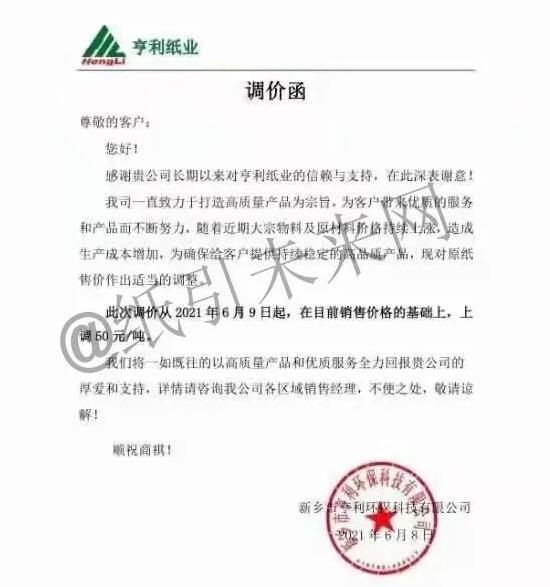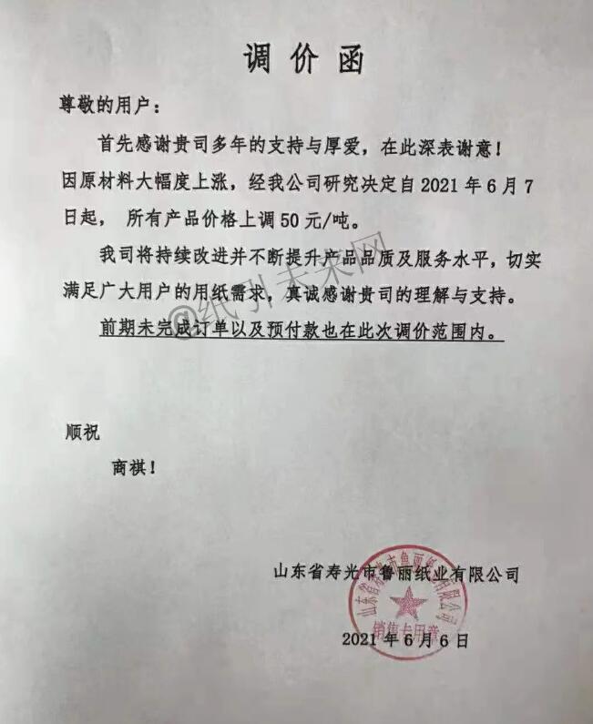 山東省壽光市魯麗紙業有限公司:因原材料大幅度上漲,經我公司研究決定自2021年6月7日起,所有產品價格上調50元/噸。