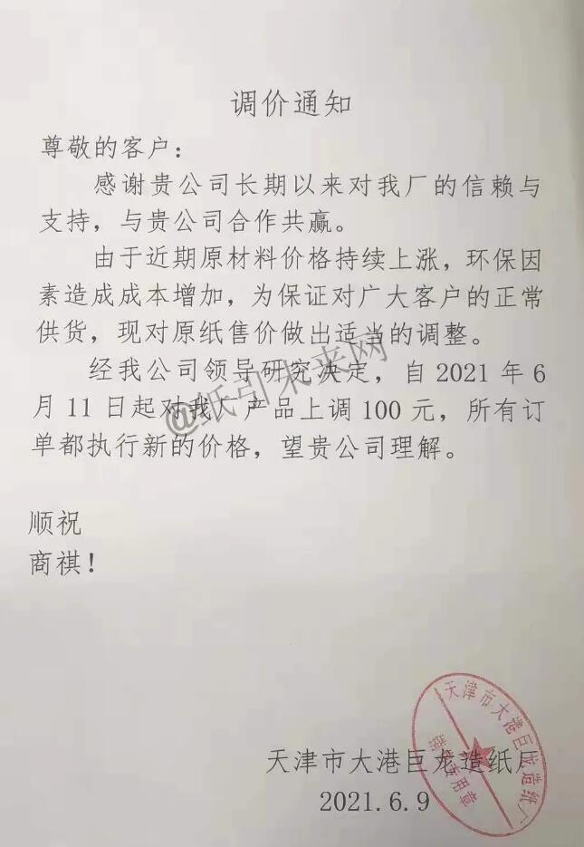 天津市大港巨龍造紙廠:由于近期原材料價格持續上漲,環保因素造成成本增加,為保證對廣大客戶的正常供貨,現對原紙售價做出適當的調整。經我公司領導研究決定,自2021年6月11日起對我廠產品上調100元。