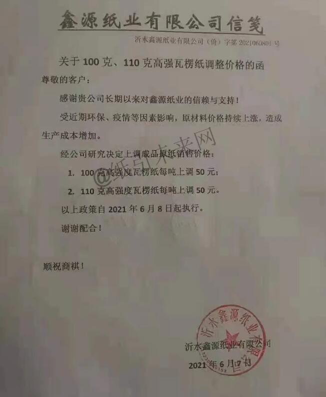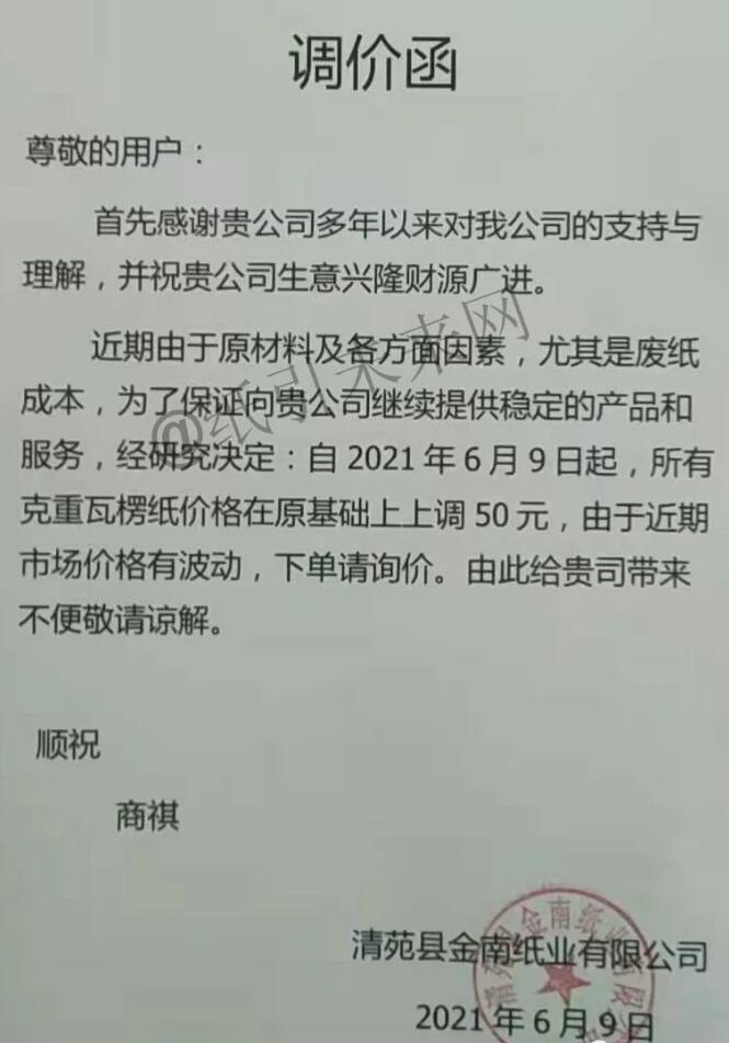 清苑縣金南紙業有限公司:近期由于原材料及各方面因素,尤其是廢紙成本,經研究決定∶自2021年6月9日起,所有克重瓦楞紙價格在原基礎上上調50元。