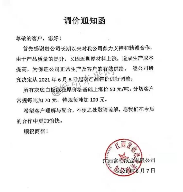 江西富臨紙業有限公司:因近期原材料上漲,造成生產成本提高,為保證公司正常生產及客戶的有效供給。經公司研究決定從2021年6月8日起對產品售價進行調整∶所有灰底白板紙在原價格基礎上漲價50元/噸。分切客戶常規每噸加70元,特規每噸加100元。