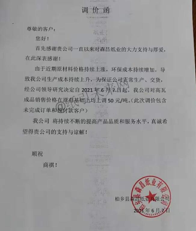 柏鄉縣森昌紙業有限公司:由于近期原材料價格持續上漲,環保成本持續增加,導致我公司生產成本持續上升,為保證公司正常生產、交貨,經公司領導研究決定自2021年6月7日起,我公司對高瓦成品銷售價格在原有基礎上均上調50元/噸。
