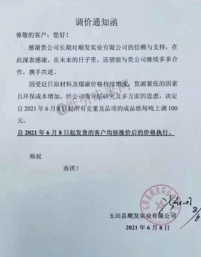 玉田縣順發實業有限公司:因受近日原材料及煤碳價格持續增漲,貨源緊張的因素且環保成本增加,經公司領導層研究及多方面的思慮,決定自2021年6月8日起所有克重及品項的成品紙每噸上調100元。自2021年6月8日起發貨的客戶均按漲價后的價格執行。
