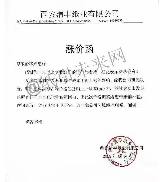 西安渭豐紙業有限公司:受廢紙原材料及其他綜合成本不斷上漲的影響,經我公司研究決定,即日起成品紙在原價格的基礎上上調50元/噸。