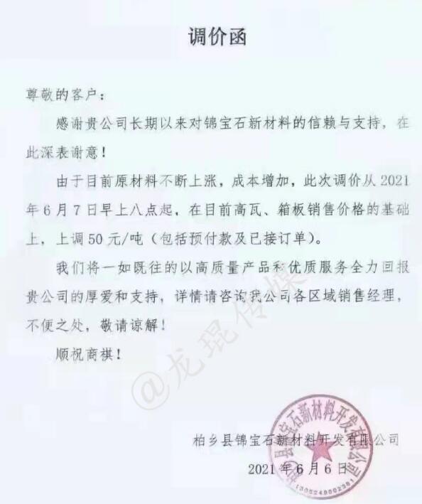 柏鄉縣錦寶石新材料開發有限公司:從2021年6月7日早上八點起,在目前高瓦、箱板銷售價格的基礎上上漲50元/噸(包括預付款及已接訂單)。