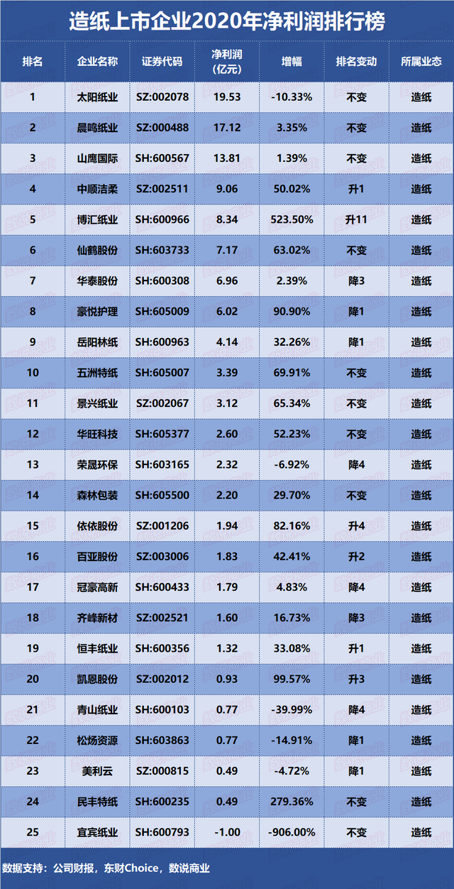 ▲造紙上市企業2020年營收排行榜 從營收規模來看,晨鳴紙業、山鷹國際、太陽紙業、博匯紙業、華泰股份等5家企業營收位于“百億俱樂部”;中順潔柔和岳陽林紙營收位于50-100億元之間; 景興紙業、仙鶴股份、齊峰新材等在內的17家企業營收位于10-50億元之間;松煬資源營收唯一不足10億元。 從營收增幅來看,有16家企業營收實現正增長,其中博匯紙業、凱恩股份、豪悅護理、依依股份、中順潔柔、宜賓紙業、美利云、五洲特紙等8家企業增幅在兩位數以上,博匯紙業增長最快,營收增幅達到43.56%。 其余9家企業營收均為下滑,其中齊峰新材和松煬資源下滑在兩位數以上,松煬資源下滑最大,營收下滑達到14.47%。 凈利潤 凈利潤是一個企業經營的最終成果,是衡量一個企業經營效益的主要指標。據數說商業統計,造紙上市企業2020年凈利潤總額為116.71億元,較上年同期的96.42億元,增加20.29億元,同比增長21.04%。平均凈利潤由上年同期的3.86億元降低至4.67億元。
