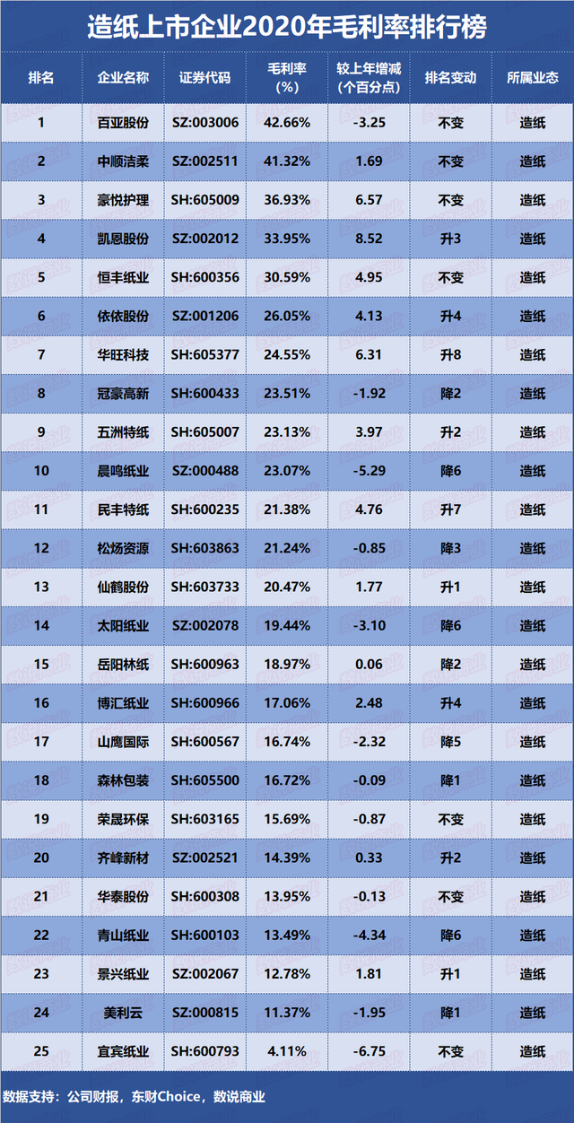 ▲造紙上市企業2020年凈資產收益率排行榜 從單個企業來看,豪悅護理是唯一一家凈資產收益率在40%以上的企業;依依股份凈資產收益率位于30%-40%之間;五洲特紙、華旺科技、百亞股份、森林包裝等4家企業凈資產收益率位于20%-30%之間; 中順潔柔、仙鶴股份、榮晟環保、博匯紙業、太陽紙業等5家企業凈資產收益率位于10%-20%之間; 山鷹國際、華泰股份、凱恩股份、景興紙業、松煬資源、冠豪高新、晨鳴紙業、恒豐紙業、岳陽林紙、齊峰新材、民豐特紙、美利云、青山紙業等13家企業凈資產收益率均不足10%;宜賓紙業凈資產收益率為負。 毛利率 毛利率可以反映商品經過生產轉換內部系統后增值的多少,即毛利率越大,增值就越多。其大小通常取決于市場競爭、企業營銷、研發成本、品牌效應及固定成本等多個因素。據數說商業統計,造紙上市企業2020年平均毛利率為21.74%,較上年同期的21.08%,增加0.66個百分點。