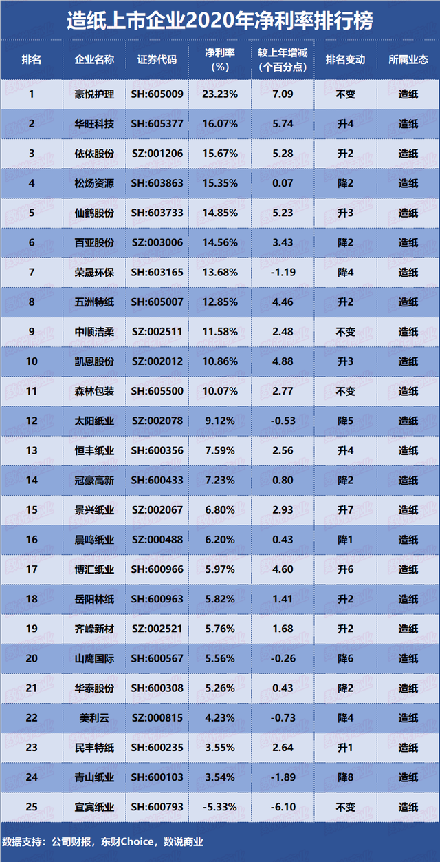 ▲造紙上市企業2020年毛利率排行榜 從單個企業來看,百亞股份和中順潔柔毛利率在40%以上;豪悅護理、凱恩股份、恒豐紙業等3家企業毛利率位于30%-40%之間; 依依股份、華旺科技、冠豪高新、五洲特紙、晨鳴紙業、民豐特紙、松煬資源、仙鶴股份等8家企業毛利率位于20%-30%之間; 太陽紙業、岳陽林紙、博匯紙業、山鷹國際、森林包裝、榮晟環保、齊峰新材、華泰股份、青山紙業、景興紙業、美利云等11家企業毛利率位于10%-20%之間;宜賓紙業毛利率唯一不足10%。 凈利率 凈利率說明企業收入1塊錢能凈賺多少錢,看該指標的時候可以和毛利率比較一下,兩者越接近說明企業的期間費用越低。據數說商業統計,造紙上市企業2020年平均凈利率為9.20%,較上年同期的7.31%,增加1.89個百分點。