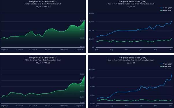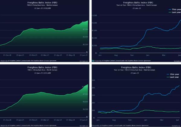 與此同時,跨太平洋航運公司將于6月15日起對亞洲至美國發(fā)貨人發(fā)起沖擊,針對每40英尺貨柜征收的GRI最高可達3000美元,一些航運公司目前至美國東海岸港口運價達到17000美元/40英尺。 跨大西洋托運人也感受到了利率上漲的影響,周環(huán)比大幅上漲:上周波羅的海運價指數(shù)(FBX)從北歐至美國部分上漲17%,至每40英尺5069美元。 上周亞洲至地中海的FBX指數(shù)進一步攀升4%,至每40英尺10696美元;亞洲至北歐的FBX指數(shù)進一步攀升5%,至每40英尺11006美元,但相關(guān)機構(gòu)從上周觀測到英國實際交付的大部分承運人報價約為每40英尺16000美元。