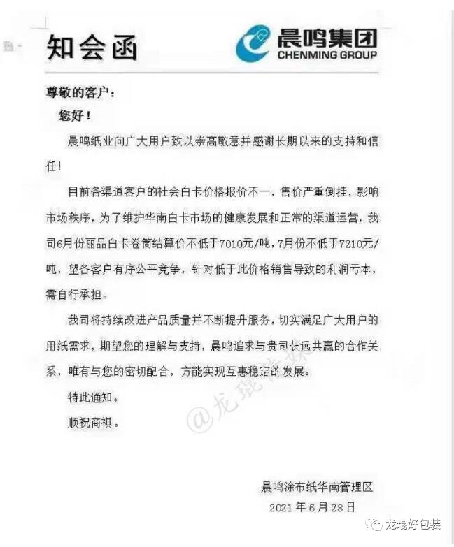 但6月份以來,白卡紙價格繼續(xù)下滑,即便是大型紙廠也難以招架,不得不采取措施,穩(wěn)住價格。6月28日,一份晨鳴涂布紙華南管理區(qū)發(fā)布的知會函在網(wǎng)絡(luò)上廣為流傳。知會函指出: 目前各渠道客戶的社會白卡紙報價不一,售價嚴(yán)重倒掛,影響市場秩序; 為維護華南白卡市場的健康發(fā)展和正常的渠道運營,公司6月份麗品白卡卷筒結(jié)算價不低于7010元/噸,7月份不低于7210元/噸; 望各客戶有序公平競爭,針對低于此價格銷售導(dǎo)致的利潤虧本,需自行承擔(dān)。