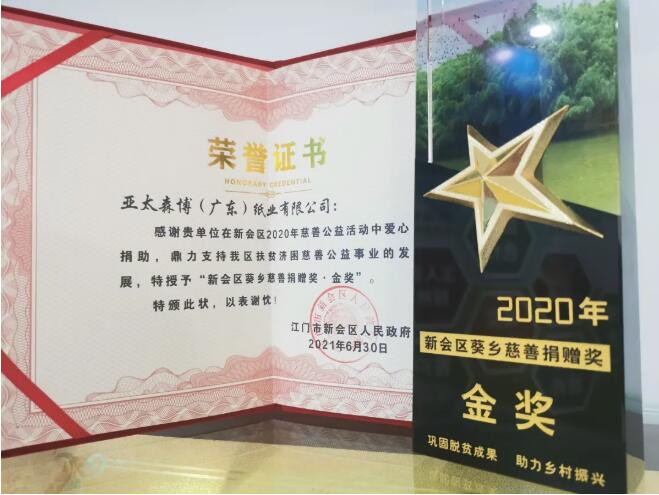 6月30日,江門市新會區(qū)舉行2021年“廣東扶貧濟困日”活動,亞太森博(廣東)紙業(yè)有限公司在大會上被授予“新會區(qū)葵鄉(xiāng)慈善捐贈金獎”,亞太森博副總經(jīng)理楊歡作為企業(yè)代表上臺接受頒獎。區(qū)委書記文彥,新會區(qū)委副書記、區(qū)長林錫波,區(qū)人大常委會黨組書記、主任梁遠(yuǎn)球,區(qū)政協(xié)黨組書記、主席林社攸等區(qū)四套班子成員出席活動。