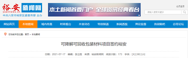 7月16日,安徽傳羽物聯(lián)科技有限公司可降解可回收紙質(zhì)包裝材料項目簽約儀式在裕安區(qū)政府會議室舉行。儀式上,裕安區(qū)委副書記、區(qū)長董永來代表區(qū)委、區(qū)政府對安徽傳羽物聯(lián)科技有限公司來裕安投資表示歡迎,并表示將竭盡全力做好對接服務,爭取項目早日落地。
