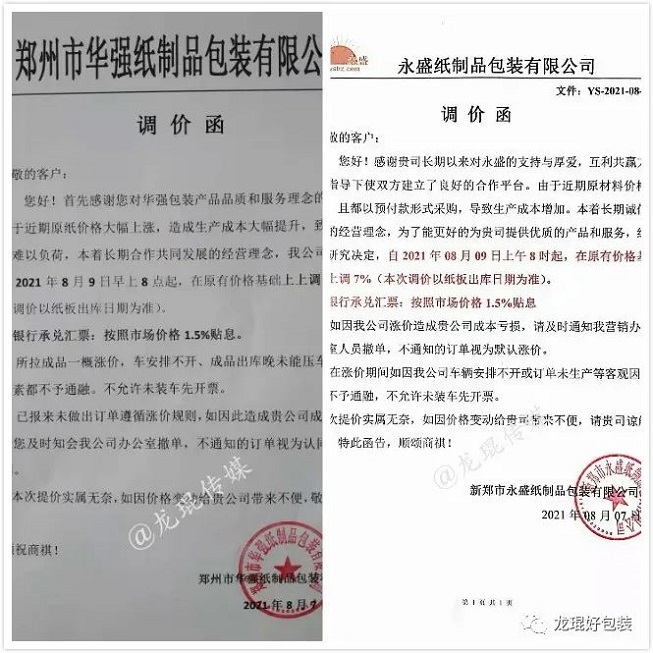 8月7日,河南省領先的紙包裝企業——鄭州中宇包裝材料有限公司/河南灝宇紙品有限公司發布通知稱:因近期汛情及疫情問題,省內造紙廠僅有的廢紙只能勉強內部循環,同時因運輸等各方面受阻,運輸費用增長,原紙價格也在持續上漲,導致公司無力承擔成本。 為此,鄭州中宇包裝材料有限公司/河南灝宇紙品有限公司表示:本著合作共贏的經營理念,經研究決定,從8月9日上午8點起,在原有價格基礎上,二層、三層、四層、五層上調7%。銀行承兌匯票按市場價格1.5%貼息。
