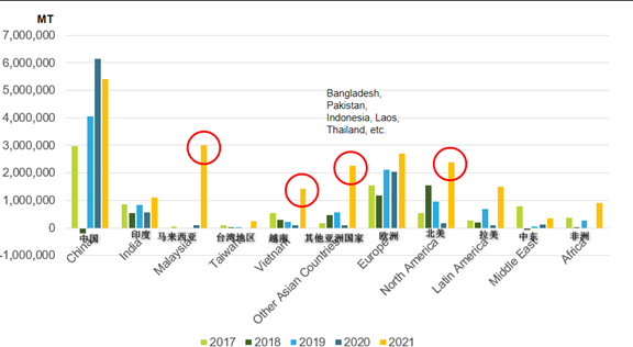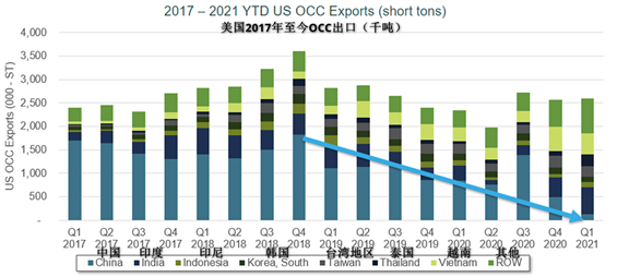 ▲紙和紙板新產(chǎn)能投資 2017年,中國實(shí)施了廢紙進(jìn)口禁令的政策,從而開始影響全球的廢紙進(jìn)出口市場。這一新政策也開始重塑亞洲、美洲和歐洲的從廢紙回收商到造紙商的整個(gè)造紙產(chǎn)業(yè)鏈。中國實(shí)施這項(xiàng)禁令是為了保護(hù)環(huán)境資源和公民健康免受由于廢紙質(zhì)量差而導(dǎo)致的高污染。 因此,廢舊瓦楞紙箱OCC(箱板紙生產(chǎn)中使用的主要類型廢紙)受到嚴(yán)重影響,許多中國工廠的進(jìn)口許可證不符合環(huán)境標(biāo)準(zhǔn)并最終被撤銷,大大減少了從美國和歐盟的廢舊瓦楞紙箱OCC進(jìn)口。2021年初,中國對廢舊瓦楞紙箱OCC進(jìn)口被全面禁止,影響了各種不同等級紙張的進(jìn)口總量。廢紙進(jìn)口的減少增加了其他等級紙張的進(jìn)口量。 隨著廢紙禁令的發(fā)布,中國也開始采取措施消除不必要的和有害的塑料垃圾。 反一次性塑料政策與2021年全面禁止廢紙進(jìn)口的政策令生產(chǎn)商爭先恐后地使用替代原料——盡管其長期的供應(yīng)及數(shù)量仍然存疑。例如,玖龍宣布新增兩條由安德里茨供應(yīng)的新BCTMP生產(chǎn)線,包括在其湖北基地用于FBB生產(chǎn)的P-RCAPMP(預(yù)處理精煉化學(xué)堿性過氧化物機(jī)械漿)技術(shù),以及一條維美德提供的CTMP生產(chǎn)線。理文還宣布,安德里茨將為其東莞和九江工廠提供兩條產(chǎn)能分別為1,000admt/d和670admt/d的化學(xué)機(jī)械纖維生產(chǎn)線,維美德將為其重慶工廠提供一條半化學(xué)漿生產(chǎn)線。 另一個(gè)例子是福建聯(lián)盛,該公司也從維美德訂購了一條BCTMP生產(chǎn)線。所有這些新的纖維生產(chǎn)線都將用于為各種包裝和圖形紙生產(chǎn)線提供紙漿。其主要原材料來源于桉樹、金合歡和楊木木屑以及木材廢料。太陽紙業(yè)已經(jīng)在其瓦楞紙生產(chǎn)中使用了木材廢料。 由于中國OCC禁令和中國制造業(yè)的持續(xù)搬遷,美國的廢舊瓦楞紙箱OCC出口已由中國轉(zhuǎn)向東南亞,如下圖所示。費(fèi)舍爾認(rèn)為,在全面禁止進(jìn)口廢紙后,伴隨限塑令的持續(xù)影響以及木纖維包裝的興起,中國對市場木漿等紙制品的需求將為行業(yè)創(chuàng)造穩(wěn)定的增長機(jī)會(huì)。