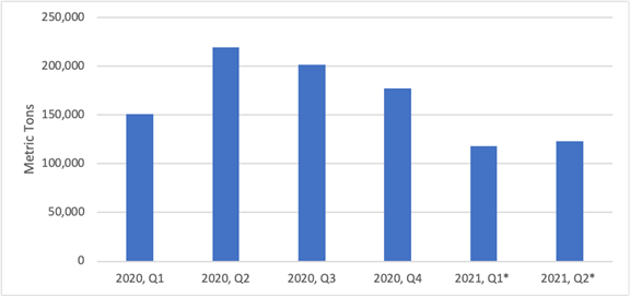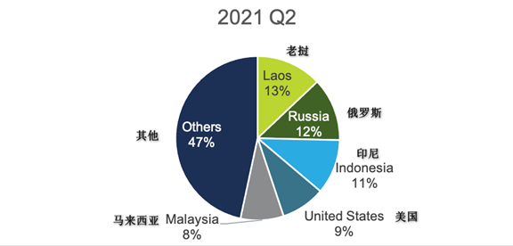 ▲2020年中國紙及紙板進(jìn)出口情況 與亞洲同行相比,2020年第四季度美國在上海的運(yùn)輸成本方面處于成本領(lǐng)先地位,成本優(yōu)勢約為100-150美元/噸。然而,鑒于近期美國和中國之間的運(yùn)費(fèi)上漲可能高達(dá)200%,成本優(yōu)勢在很大程度上受到侵蝕。當(dāng)入研究對中國市場的箱板紙出口的細(xì)節(jié)時(shí),我們可以看到,美國在2021年第二季度失去了對其他國家的第二大供應(yīng)商地位,自2020年以來對中國的出口有所下降(下圖)。然而,我們可以有把握地假設(shè),如果運(yùn)費(fèi)成本長期繼續(xù)保持高位,正如ING所提到的,美國生產(chǎn)商將箱板紙運(yùn)往中國的盈利機(jī)會(huì)將會(huì)減少。