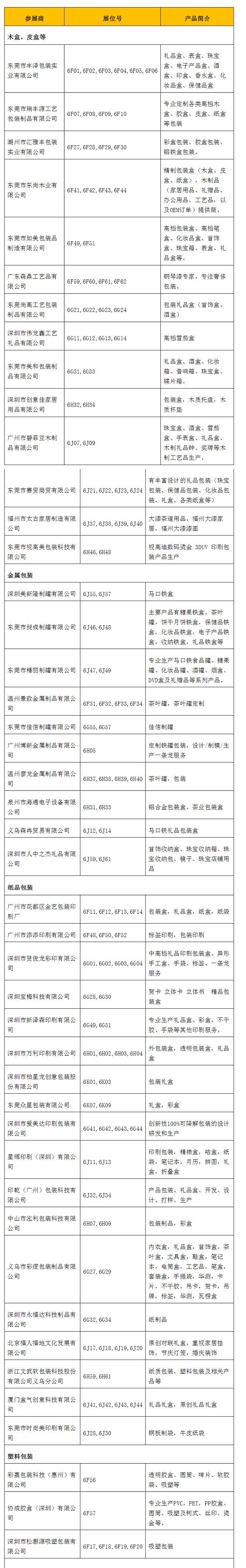 展商列表搶先看鎖定目標效率高 截至目前,已有近150家包裝企業報名參展。行業翹楚薈萃,柏星龍、協成、東尚、三匠工藝、豐澤、瑞豐源、賢俊龍、精麗制罐等知名企業入駐。部分展商名單提前劇透!