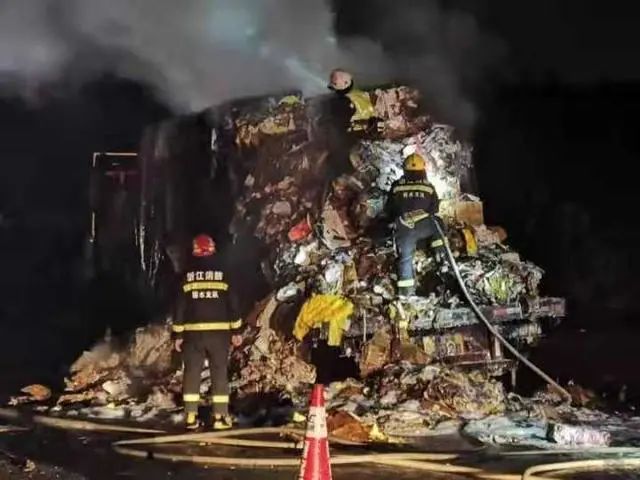 9月3日晚上8時46分,麗水高速交警接到報警求助,長深高速麗龍段處,一輛運輸壓縮廢紙的貨車起火,駕駛員自己正在滅火并請求支援。 高速交警指揮中心接警后立即派就近的浙江交通集團的巡查人員到達現場,同時第一時間請求消防部門前往現場進行救援并要求在龍泉方向塔石收費站進行分流。10分鐘到達現場后,巡查人員和駕駛員立即用所帶的的滅火器對貨車進行滅火,由于廢紙并且是經過壓縮,火越滅越大,在用完車上的所有滅火器后,還是沒有把大火控制住。 隨后趕到現場的民警立即對現場進行了截流,并把所有人員撤離到安全地帶等待消防進行救援。21時18分,接到救援后的消防人員到達現場進行施救,隨著消防水槍的一陣陣猛射,現場的火勢時滅時起,由于廢紙是經過壓縮的,這也增加了滅火的難度,眼看著明火被滅了,壓縮紙內部的高溫經過一段時間的發熱又竄出猛烈的火苗。此時,跟隨消防一起開來的一輛挖機和一輛推土車把車上已經燃燒的廢紙從車上扒下來給消防車進行滅火,經過半個小時合力滅火,終于把這輛車的火給滅了,隨后高速交警組織養護對現場進行清理,到當晚的23時20分左右,高速公路恢復正常。
