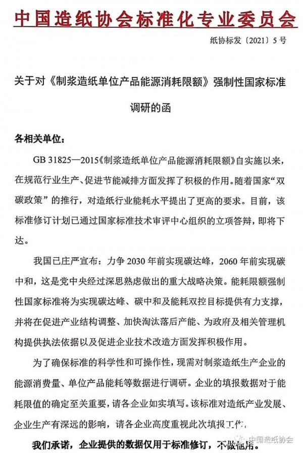 關于對《制漿造紙單位產品能源消耗限額》強制性國家標準調研的函