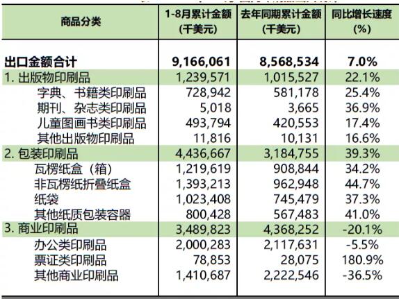 同期,國內印刷品出口91.66億美元,同比增長7.0%(參見表3)。其中,出版物印刷品出口12.40億美元(同比增長22.1%),包裝印刷品出口44.37億美元(同比增長39.3%),商業印刷品出口34.90億美元(同比下降20.1%)。 表3 2021年1-8月 國內印刷品出口統計