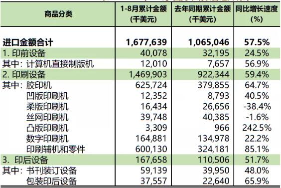 相關印刷品主要子項出口,字典書籍類印刷品7.29億美元(同比增長25.4%),期刊雜志類印刷品501.8萬美元(同比增長36.9%),兒童圖畫書類印刷品4.94億美元(同比增長17.4%),瓦楞紙盒(箱)12.20億美元(同比增長34.2%),非瓦楞紙折疊紙盒13.93億美元(同比增長44.7%),紙袋10.23億美元(同比增長37.3%),辦公類印刷品20.00億美元(同比下降5.5%),票證類印刷品7885.3萬美元(同比增長180.9%),其他商業印刷品14.11億美元(同比下降36.5%)。 同期,國內印刷品進出口貿易順差74.79億美元(同比增長7.1%)。 國內印刷裝備進出口概況 2021年1-8月國內印刷裝備進口16.78億美元,與去年同期相比增長57.5%(參見表4)。其中,印前設備進口0.40億美元(同比增長24.5%),印刷設備進口14.70億美元(同比增長59.4%),印后設備進口1.68億美元(同比增長51.7%)。 表4 2021年1-8月 國內印刷裝備進口統計