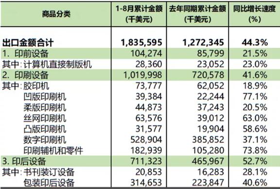 相關設備主要子項進口,計算機直接制版機1201.0萬美元(同比增長56.9%),膠印機6.26億美元(同比增長64.7%),凹版印刷機1235.2萬美元(同比增長40.5%),柔版印刷機1643.4萬美元(同比下降38.4%),絲網印刷機3974.8萬美元(同比下降1.6%),凸版印刷機330.9萬美元(同比增長242.5%),數字印刷機1.65億美元(同比增長22.2%),印刷輔機和零件6.00億美元(同比增長85.1%),書刊裝訂設備5913.9萬美元(同比增長48.0%),包裝印后設備3755.7萬美元(同比增長65.9%)。 同期,國內印刷裝備出口18.36億美元,較去年同期增長44.3%(詳見表5)。其中,印前設備出口1.04億美元(同比增長21.5%),印刷設備出口10.20億美元(同比增長41.6%),印后設備出口7.11億美元(同比增長52.7%)。 表5 2021年1-8月 國內印刷裝備出口統計