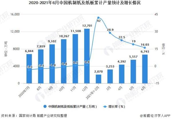 2020-2021年6月中國機制紙及紙板累計產量統計及增長情況