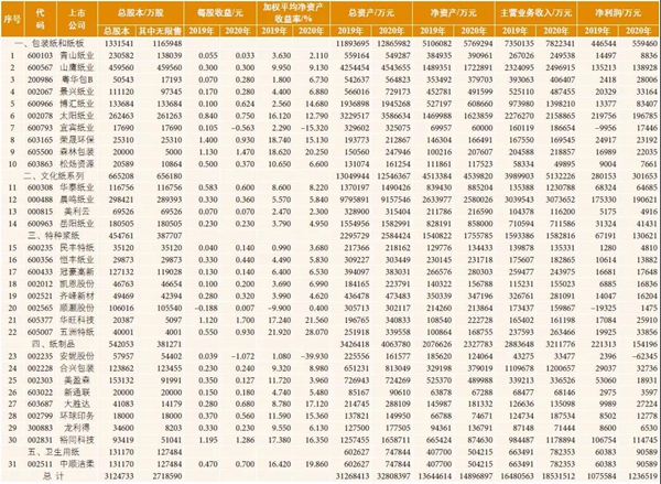 當今世界正經歷百年未有之大變局,2020 年新冠疫情全球大流行使這個變局加速演進,經濟全球化遭遇逆流,世界經濟低迷,國際貿易和投資大幅萎縮,我國國民經濟經歷了“穩、保、搶”三部曲,克服了重重困難,行業基本保持了平穩與健康,在世界主要經濟體中率先實現正增長;以國內大循環為主體,國內國際雙循環相互促進的新發展格局正在加快構建。 我國造紙工業經過近30 年的快速發展,行業規模持續增長,已從過去緊缺型變成基本平衡型,多數產品已基本滿足國內市場需求。據中國造紙協會調查資料,2020 年全國紙及紙板生產企業約 2500 家,全國紙及紙板生產量 11260 萬t,較上年增長 4.60%。消費量11827 萬t,較上年增長 10.49%,人均年消費量為 84 kg(14.00 億人)。2011—2020 年,紙及紙板生產量年均增長率 1.41%,消費量年均增長率 2.17%。根據國家統計局數據,2020 年全國規模以上紙制品生產企業 4184 家,生產量 6860 萬t,較上年下降4.97% ;消費量 6552 萬t,較上年下降4.85% ;進口量 16 萬t,出口量 324 萬t。2011—2020 年,紙制品生產量年均增長率 4.76%,消費量年均增長率 4.82%。 造紙業作為重要的基礎原材料產業,在國民經濟中占據重要地位,造紙業關系到國家經濟各個方面,其產品用于文化、教育、科技和國民經濟的眾多領域。隨著環保措施和供給側改革的推進,造紙行業的階段性和結構性過剩將顯著改善,供給結構將不斷優化。未來,在綠色環保生態發展方式指引下造紙行業供需將呈趨緊態勢。 1.上市公司總體概述 參照滬深兩市最新行業板塊劃分,截至2020 年底在深滬兩市正常運作的含有造紙和紙制品業的上市公司為31 家。本年度整個板塊盈利指標獲得較大提高,全產業鏈(產業或服務一體化)安全意識和綠色環保發展理念獲得持續增強,造紙工業可循環發展的特征在社會形象上得到了較充分的彰顯。 1.1 龍頭企業凸顯優勢,整體經營狀況持續穩定發展 面對復雜環境,各公司克服諸多困難,除個別企業經營不善外,總體業績持續穩定提升。31 家上市公司總股本數3124733 萬股(其中無限售流通股2718590萬股)(見表1);總資產3281 億元,比2019 年凈增約154 億元,增長4.93% ;凈資產達1490 億元,比2019年凈增125 億元,增長9.18%;主營業務收入1853 億元,比2019 年凈增205 億元,增長12.44% ;實現凈利潤123.65 億元,比2019 年凈增16.09 億元,增長14.96%。平均資產負債率54.59%,比2019 年下降1.77 個百分點,有效控制在60% 以下的合理水平。2020 年平均銷售凈利潤6.67%,比2019 年提高0.15 個百分點;2020平均總資產收益率3.77%,比2019 年提高0.33 個百分點。特別是重點企業繼續承擔了這一板塊的盈利責任,凈利潤超過3 億元的有晨鳴、太陽、山鷹、華泰、岳陽、博匯、五洲、中順潔柔等10 家企業,比2019 年增加3 家,10 家企業合計凈利潤90.6 億元,盈利比重占總盈利的69%,起到中流砥柱的作用。太陽紙業連續第二年高居盈利首位,占10 家企業合計總凈利潤的20%左右。 表1 2020年造紙版塊主要經濟指標一覽表