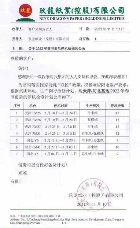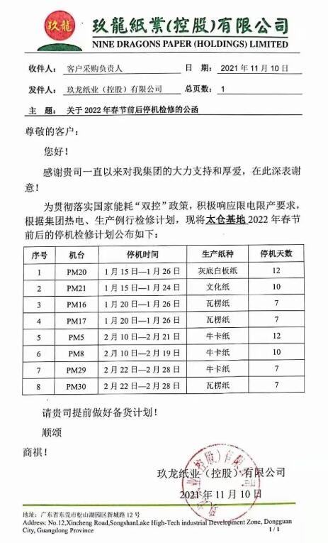 11月8-10日,玖龍紙業各基地陸續發布2022年春節停機計劃,東莞、太倉、天津、唐山以及泉州五個基地大部分紙機將在2022年1月15日至4月21日期間輪停7-31天,根據設計產能計算,合計將減產約48.5萬噸。 廣東東莞 作為玖龍紙業生產規模最大的基地,東莞工廠全部16臺紙機自1月22日至4月21日輪流停機,預計減產29.28萬噸。 根據設計產能測算,此次春節停機預計減產箱板瓦楞紙約17.73萬噸,文化紙1.18萬噸,以及白板紙約10.37萬噸。