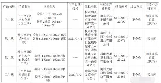 衛(wèi)生紙有四批次產(chǎn)品抽檢不合格,生產(chǎn)企業(yè)為山東泉林集團(tuán)有限公司、泰盛(江西)生活用品有限公司、眉山若禺衛(wèi)生用品有限公司和衢州龍游雙熊貓紙業(yè)有限公司。