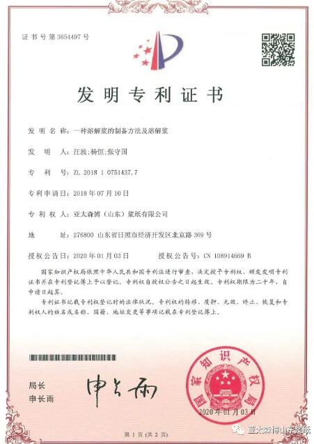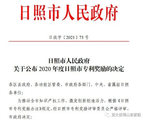 近日,日照市政府發布了《關于公布2020年度日照市專利獎勵的決定》(日政字[2021]73號),亞太森博(山東)漿紙有限公司完成的“一種溶解漿的制備方法及溶解漿”發明專利,榮獲日照市專利獎二等獎。