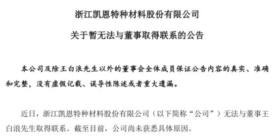 10月21日晚間,凱恩股份公告,近日已無法與董事王白浪取得聯系。
