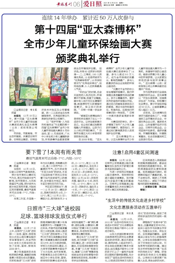 《日照日報》 整版公告 12月19日上午 第十四屆“亞太森博杯” 全市少年兒童環保繪畫大賽頒獎典禮 在亞太森博(山東)漿紙有限公司舉行