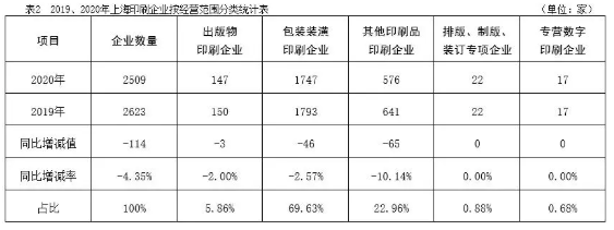 2020年,上海印刷業全行業工業總產值為797.64億元,比2019年下降2.04%,但是銷售收入和利潤總額卻雙雙呈現增長,其中銷售收入為959.71億元,比2019年增長4.12%;利潤總額為81.29億元,比2019年增長6.10%,整個印刷業仍然保持較高的盈利能力。由于疫情的影響,2020年對外加工貿易額下降了11.50%,總額為89.85億元,比2019年減少了11.68億元。 1.按企業經營范圍分類(詳見表2) ●出版物印刷企業為147家,占企業總數的5.86%,比2019年減少3家,下降4.35%; ●包裝裝潢印刷企業為1747家,占企業總數的69.63%,比2019年減少46家,下降2.57%; ●其他印刷品印刷企業為576家,占企業總數的22.96%,比2019年減少65家,下降10.14%; ●排版、制版、裝訂專項企業為22家,占企業總數的0.88%,與2019年持平; ●專營數字印刷企業為17家,占企業總數的0.68%,與2019年持平。