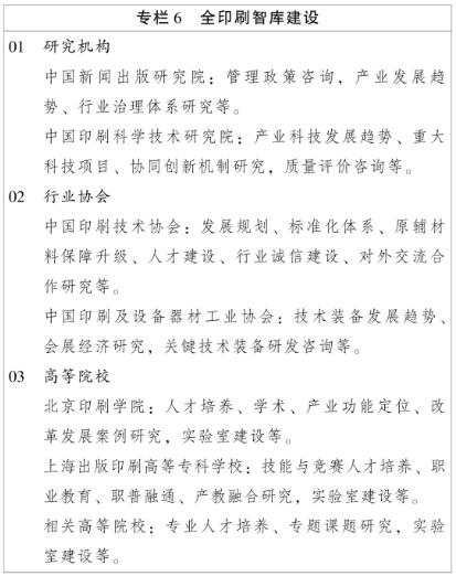 五、加快推進區域協調發展 貫徹區域協調發展戰略,深化落實北京、長三角、珠三角三個升級指南要求,引導支持各地出臺有關政策,形成特色鮮明、優勢互補,融合互動、全面升級的新型產業布局。 (一)建設京津冀協同發展先行區。緊貼保障首都核心功能任務要求,完善京津冀出版物印刷保障體系建設,發布三地出版物印刷協同保障企業名單。實現京津冀印刷資質互認,提升三地協同監管信息化水平。推動京津冀聯合出臺印刷業區域布局政策指引,建設認定一批協同發展先行示范基地,打造若干協同發展交流合作平臺。建設全國印刷業創意設計中心、印刷物流集散基地、新材料研發中心。 (二)建設長三角一體化創新高地。出臺長三角印刷業一體化發展升級的創新中心、先進產業集群和優勢企業名單。以上海為龍頭,引領科技創新和國際交往;以江蘇和浙江為重點,深化轉型升級和綠色發展;以安徽為支撐,加快產業承接和特色發展。推動長三角三省一市建立發展協商機制和資源對接平臺,統籌設計制度政策,打造一批區域創新發展集群,加快構建產業發展生態圈。 (三)建設珠三角印刷業高水平對外開放連接平臺。加強粵港澳用產學研協同發展,建設連接國內外的印刷業務信息服務系統,推動成立印刷標準化交流促進中心和印刷文化交流研究中心,培育數字印刷、印刷智能制造和印刷戰略新興等三類產業集群,鞏固提升珠三角九市印刷業比較優勢和綜合協同優勢。出臺珠三角印刷業對外開放連接平臺建設的核心單位名單和重點項目名單。 (四)增強梯度發展韌性。鼓勵支持西部地區發展數字印刷、紙包裝印刷、印刷裝備制造和印刷原輔材料,提升出版物印刷基礎發展水平。鼓勵支持東北地區發展出版物印刷、包裝印刷和印刷軟件服務,培育新興特色印刷。鼓勵支持中部地區建設一批中高端產業集群,積極承接優質印刷產業布局和轉移。鼓勵支持區域合作互助,推動東部龍頭骨干企業在東北地區和中西部地區投資興業,有效服務鄉村振興戰略。鼓勵支持革命老區、民族地區因地制宜發展特色印刷。鼓勵支持邊境地區建設區域性印刷業對外開放連接平臺。 六、全面提高對外開放合作水平 深化印刷業對外開放合作,加強安全保障,形成全印刷、高水平、可持續的對外開放新格局。 (一)建設國際印刷技術交流合作平臺。統籌推進各類開放平臺建設,鼓勵支持辦好北京國際印刷技術展覽會、中國國際全印展等重點展會,發揮珠三角對外開放連接平臺引領帶動作用,鼓勵支持行業協會、高等院校、研究機構和骨干企業共同打造高端合作交流平臺。鼓勵支持骨干企業參加世界大展。建立健全“一帶一路”印刷信息合作網絡,探索建設“一帶一路”印刷產能技術交流合作平臺。 (二)提高“走出去”和“引進來”的質量水平。促進國內國際雙循環。支持龍頭骨干和特色印刷企業、印刷裝備器材企業走出去。支持兩岸四地印刷業深化合作,共同開拓國際市場。推動對外加工貿易高質量、差異化、創新性發展,拓展第三方市場合作。擴大先進技術和重要裝備進口,推動進口來源多元化,引導外資更多投向數字印刷和綠色原輔材料等領域,引導外資更多投向中西部地區。發展“走出去”和“引進來”的信息平臺。 (三)增強印刷領域國際話語權。加強產業發展與治理國際溝通交流,依托世界印刷與傳播論壇、亞太印刷技術論壇等國際組織,提出更多的中國方案,合力推動全球印刷業健康可持續發展。承擔好國際標準化組織印刷技術委員會秘書處及主席的工作。推動我國優勢印刷技術標準成為國際標準,弘揚傳播中華優秀印刷文化。建立健全安全審查和風險預警防范體系。 七、加強人才建設 貫徹落實新時代人才強國戰略,加強全印刷領域思想政治引領和專業素質提升,尊重勞動、尊重知識、尊重人才、尊重創造,建設愛黨報國、敬業奉獻、結構合理、能干善創的高素質人才隊伍。 (一)完善全印刷智庫建設。圍繞大局大事和重大需求,開展前瞻性、針對性、儲備性研究,建設特色鮮明、規模適度的印刷智庫。支持研究機構在決策咨詢、產業發展、標準制定等方面發揮更大作用,支持行業協會建設專題數據庫,支持高等院校建設相關實驗室,支持骨干企業興辦技術研究應用基地。培育具有國際影響力的印刷智庫。建立運行規范、充滿活力、監管有力的智庫管理體制。