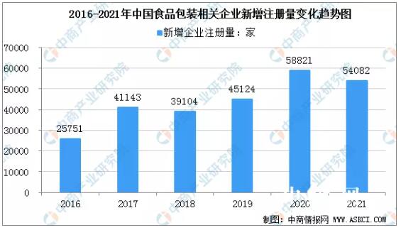 數據來源:中商產業研究院整理 2、食品包裝相關企業 2016-2020年,我國食品包裝相關企業新增量呈穩步上升的趨勢,這反映行業入局者逐漸增多,市場競爭日益激烈。2020年我國食品包裝相關企業新增量達58821家,相較上年增加近14000家,在雙碳政策加緊推進之下,2021年中國食品包裝相關企業新增量有所下降,為54082家。