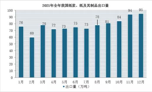 據海關總署公布數據顯示,2021年1-12月我國紙漿、紙及其制品出口量為938萬噸,同比增長2.4%;出口額為15738822萬元,同比增長8.1%。