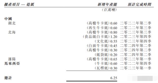 報告期內,集團以可持續增長為發展基礎,定下了周詳的全產業發展藍圖。集團正積極興建高端牛卡、食品級白面牛卡、紙袋紙等造紙新產能,此等結構性升級擴張將有效提升高利潤產品占比。