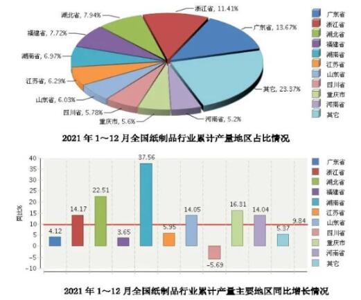 紙制品年產量7740萬噸 該份報告將紙和紙板容器制造行業分為箱紙板和紙制品兩部分,其中紙制品2021年全國累計完成產量7739.06萬噸,同比增長9.84%。