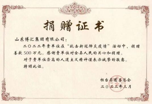 面對今年春天全國范圍內(nèi)新冠疫情卷土重來的嚴(yán)峻形勢,金光集團(tuán)始終時刻關(guān)注,攜手黃奕聰慈善基金會和旗下企業(yè),心手相連眾志成城,第一時間向淄博桓臺、欽州港、吉林市、長春市、上海市、泉州市等地捐贈總價值1000萬的資金及物資抗擊疫情,用愛驅(qū)散“寒意”,助力打贏這場疫情阻擊戰(zhàn)! 大愛無疆 博匯集團(tuán)捐資500萬元助力抗疫 3月17日,面對山東淄博桓臺縣嚴(yán)峻的新冠形勢,博匯集團(tuán)在金光集團(tuán)APP(中國)總部的全力支持下,向山東省淄博市桓臺縣慈善總會捐款500萬元,助力桓臺及地方抗擊防控新冠疫情,以實際行動詮釋了愛國企業(yè)的社會責(zé)任擔(dān)當(dāng)。