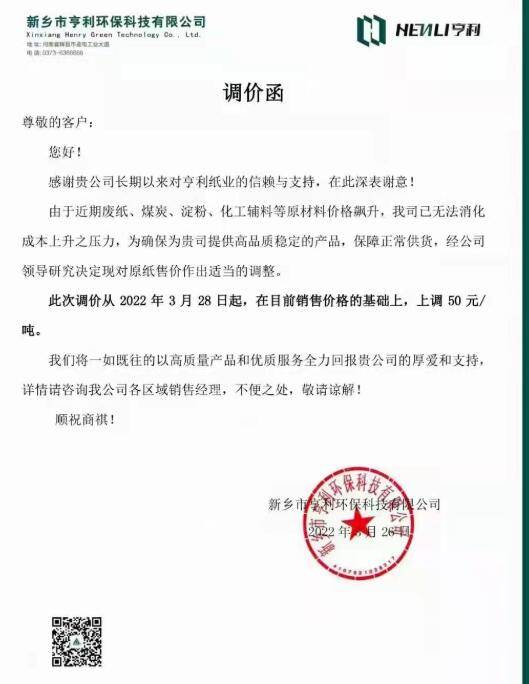 除了玖龍、山鷹之外,其余紙廠也不甘弱后,相繼宣布在本月底或下月初漲價。其中,山東世紀陽光在3月22日就對瓦楞紙、箱板紙上調50元/噸;江門明星紙業、新鄉市亨利環保于3月28日開始漲價50元/噸;東莞建暉紙業的灰底白板紙從4月3日起上漲100元/噸。 山東世紀陽光紙業: