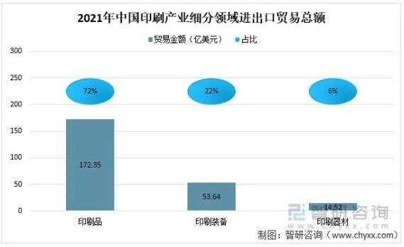資料來源:國家海關總署、智研咨詢整理 2021年國內印刷產業進出口貿易總值為240.52億美元。其中,印刷品進出口172.35億美元、印刷裝備進出口53.64億美元,印刷器材進出口14.52億美元。印刷品及印刷裝備、印刷器材三大類商品的進出口占國內印刷產業進出口貿易總值的比重分別為72%、22%和6%。同期,國內印刷產業進出口貿易順差為126.40億美元。 2021年中國印刷產業細分領域進出口貿易總額