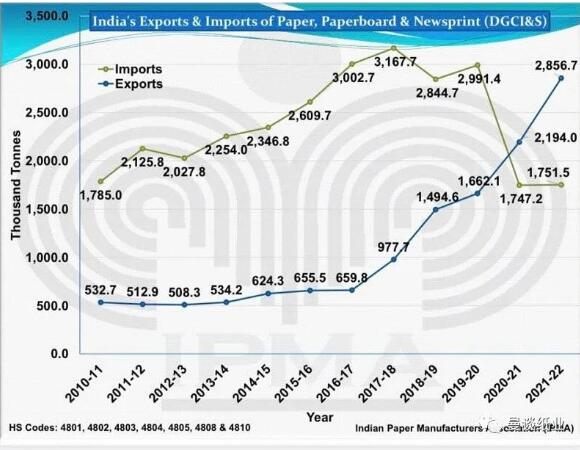 印度的紙張出口在過去五年中一直在上升。從數量上看,印度的紙張出口量從2016-2017財年的66萬噸增長到2021-2022財年的285萬噸,增長了四倍。同一時期里,出口的產值從304.1億印度盧比增長至1396.3億印度盧比。