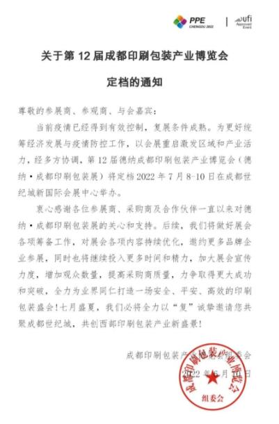 各位關心和支持 德納·成都印刷包裝展的朋友們, 久等啦! 當前疫情已經得到有效控制,復展條件成熟 為更好統籌經濟發展與疫情防控工作, 以會展重啟激發區域和產業活力, 國內多個城市恢復舉辦展會。 經多方協調, 第12屆成都印刷包裝產業博覽會定檔啦!