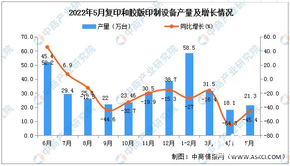 2022年5月全國復印和膠版印制設備產(chǎn)量為21.3萬臺,同比下降45.4%。2022年1-5月全國復印和膠版印制設備產(chǎn)量129.3萬臺,同比下降29.4%。