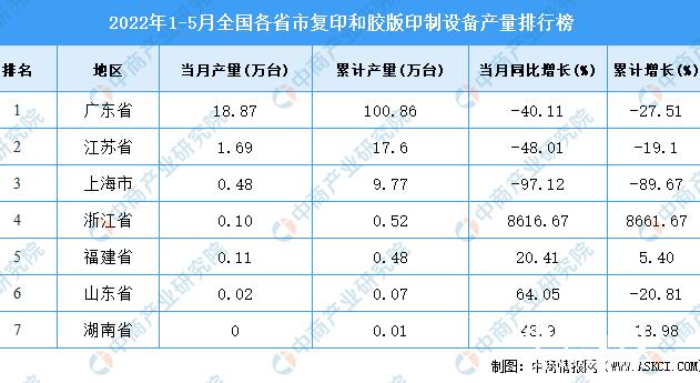 2022年1-5月廣東省復印和膠版印制設備產(chǎn)量排名第一,累計產(chǎn)量為100.86萬臺。