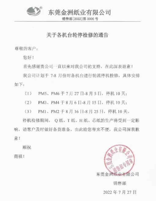 7月27日,東莞地區又一造紙巨頭加入“停機潮”。據東莞金洲紙業《關于各機臺輪停檢修的通告》顯示,該紙企計劃在7-8月份對6臺紙機進行輪流停機檢修。停機檢修期間,Q紙、T紙、H紙、芯紙的生產將受到影響。 東莞金洲紙業最先開展停機的紙機是PM5和PM6,時間為7月27日-8月5日;緊接著,PM3、PM4將在8月6日-8月15日期間停機10天;PM1和PM2則在8月16日-8月25日期間停機10天。