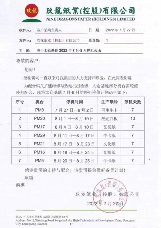 繼東莞玖龍宣布停機(jī)檢修之后,7月27日-7月28日,玖龍紙業(yè)旗下太倉(cāng)、泉州、重慶、沈陽(yáng)、河北及天津基地亦相繼發(fā)布輪流停機(jī)計(jì)劃。 在新宣布停機(jī)檢修的六大基地中,除沈陽(yáng)玖龍僅在7月27日-7月29日對(duì)一條紙機(jī)停機(jī)3天外,其余生產(chǎn)基地均涉及多臺(tái)紙機(jī),且單臺(tái)紙機(jī)停機(jī)時(shí)長(zhǎng)至少在5天以上,有的甚至長(zhǎng)達(dá)21天。 太倉(cāng)玖龍 太倉(cāng)玖龍最早停機(jī)的紙機(jī)為再生牛卡紙機(jī)PM8,停機(jī)時(shí)間為7月27日-8月2日。除PM8外,停機(jī)時(shí)長(zhǎng)為7天的紙機(jī)還包括瓦楞紙機(jī)PM17、PM16,牛卡紙機(jī)PM29、PM5,以及文化紙機(jī)PM21。灰底白板紙機(jī)PM20停機(jī)時(shí)間最久,為10天。 太倉(cāng)玖龍紙業(yè)是玖龍紙業(yè)目前旗下第二大生產(chǎn)基地,共有8臺(tái)紙機(jī),總設(shè)計(jì)年產(chǎn)能超300萬(wàn)噸。本次停機(jī)計(jì)劃中,僅有瓦楞紙機(jī)PM30未被列入其中。