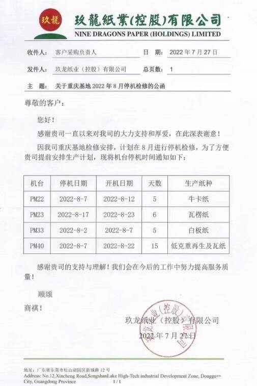 重慶玖龍 重慶玖龍?jiān)?月份共有4臺(tái)紙機(jī)進(jìn)行停機(jī)檢修,時(shí)間為8月2日-8月17日,停機(jī)檢修期間將影響牛卡紙、瓦楞紙、白板紙的正常供應(yīng)。其中,生產(chǎn)低克重再生及瓦楞紙的PM40停機(jī)時(shí)間最長(zhǎng),將自8月7日起停產(chǎn)15天。 據(jù)了解,重慶玖龍目前共有4臺(tái)紙機(jī),總設(shè)計(jì)年產(chǎn)能為190萬(wàn)噸。換而言之,8月份,重慶玖龍每臺(tái)紙機(jī)均將停機(jī)5-15天。