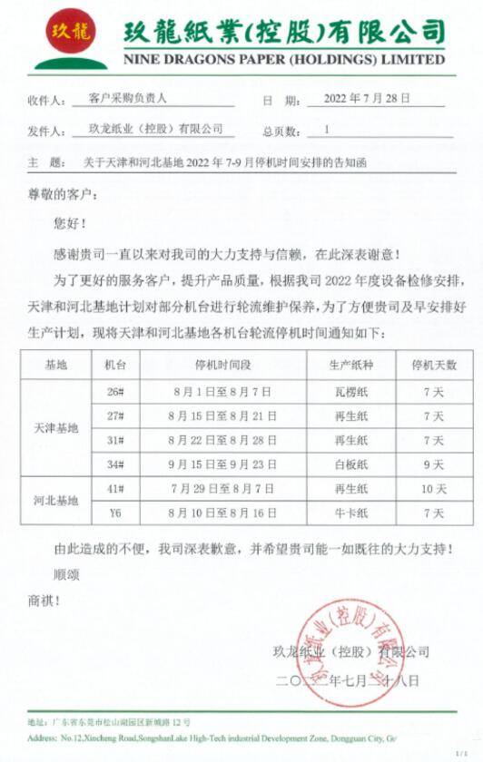 天津及河北玖龍 天津玖龍將有3臺(tái)紙機(jī)在8月份停產(chǎn)7天,分別為瓦楞紙機(jī)26#、再生紙機(jī)27#和31#。此外,白板紙機(jī)34#將在9月份停機(jī)檢修,時(shí)間為9月15日-9月23日,停機(jī)時(shí)長(zhǎng)為9天。 河北玖龍共有兩臺(tái)紙機(jī)將停機(jī)檢修,其中再生紙機(jī)41#從7月29日起停機(jī)10天,牛卡紙機(jī)Y6在8月10日-8月16日期間停機(jī)7天。